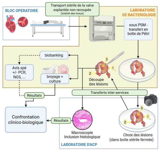 Cette procédure, schématisée dans la figure ci-joint, implique que l’ensemble du matériel explanté soit envoyé dans un contenant stérile au laboratoire de Bactériologie sans fragmentation de ce matériel au bloc opératoire comme cela est habituellement pratiqué. Au laboratoire de Bactériologie la pièce opératoire est disposée, en conditions de manipulations stériles (L2), dans une boite de Pétri stérile de manière à exposer au mieux les zones pathologiques. Cette boite, refermée, est ensuite emportée au laboratoire d’ACP en vue d’un examen macroscopique conjoint par l’ACP et la Bactériologiste. Cet examen conjoint, éventuellement réalisé à distance grâce à la télétransmission en vidéo, permet de désigner les zones pathologiques qui sont tracées dans le dossier de laboratoire de bactériologie et dans celui d’anatomopathologie s’ils sont distincts. Les zones pathologiques sont ensuite découpées stérilement au laboratoire de bactériologie en essayant, pour chacune de ces lésions, de conserver intact un équivalent analysable par l’anatomopathologiste et, si possible, de conserver des fragments en vue d’analyses moléculaires. Le tissu valvulaire restant est ensuite transmis au laboratoire d’anatomopathologie pour la prise en charge spécifique.